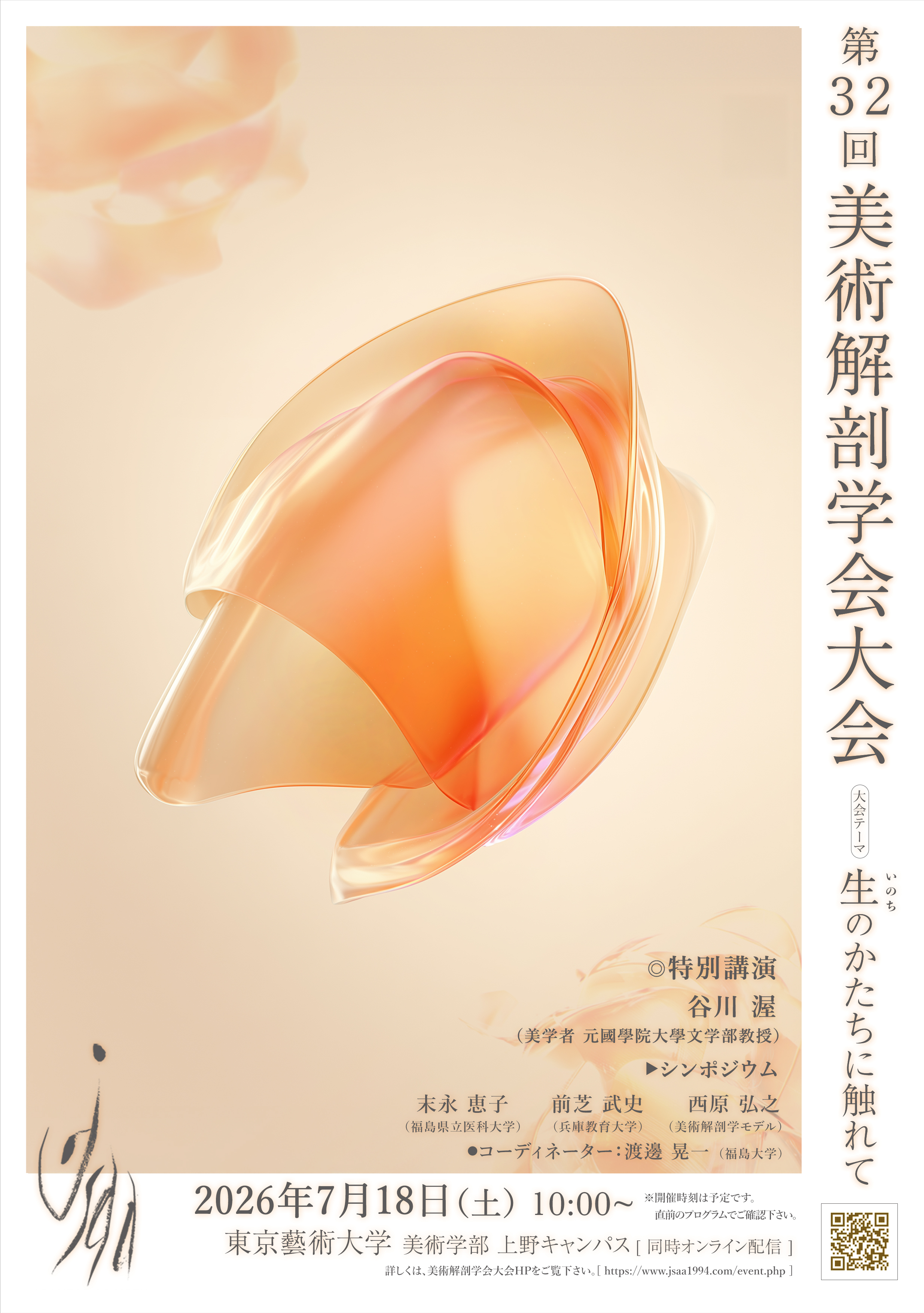 美術解剖学会では第32回美術解剖学会大会の大会テーマを『生 (いのち) のかたちに触れて』とし、例年通り7月の第3土曜日 (7月18日) に、対面と遠隔配信 (ZOOM によるオンライン方式) とのハイブリッドで行う準備をすすめております。
