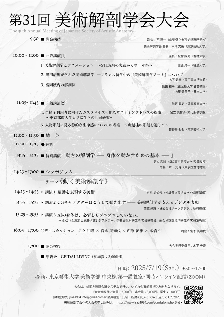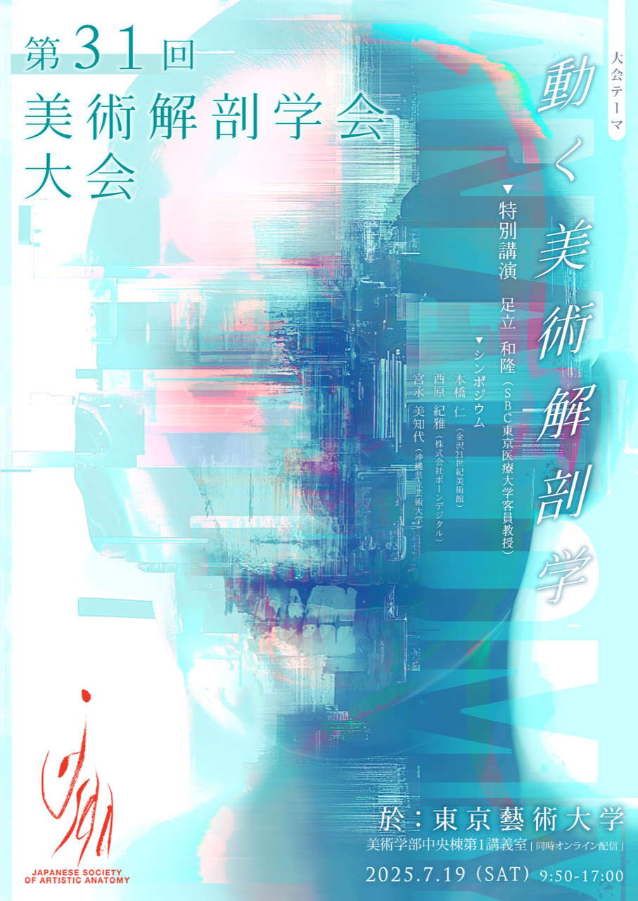 近年、本学会ではリアリティをテーマに、AI、VR、XR、人体の動きの表現など、最新の研究と向き合ったテーマで、アート & サイエンスの相関関係から多様化する造形表現の美に関する議論を重ねて参りました。今回は、美術と解剖学の両側面から生 (いのち) と向き合うテーマを設定しました。